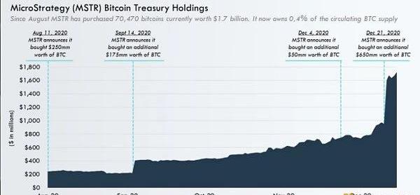 MicroStrategy(MSTR)宣布购买价值2.5亿美元的BTC(共计21,454个),作为新资本配置政策的一部分,以对冲通胀。在接下来的几个月里,MSTR将继续购买70,470个比特币。它目前持有BTC价值超过17亿美元。