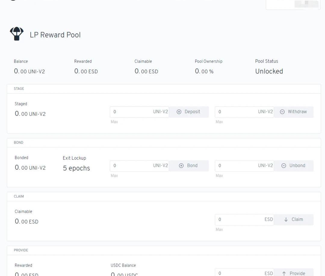 在STAGE栏,先将ESDStage,再在BOND栏,将Staged状态的ESD转换成Bonded状态,就可以坐等收益了。每个Epoch后,收益会自动加在Bonded余额中。需注意的是:一旦ESDbonded,要等待15epochs才能取出,5天时间,足够亏很多钱了。此锁仓时间会在你新增锁仓资金时重置。再就是参与LP。