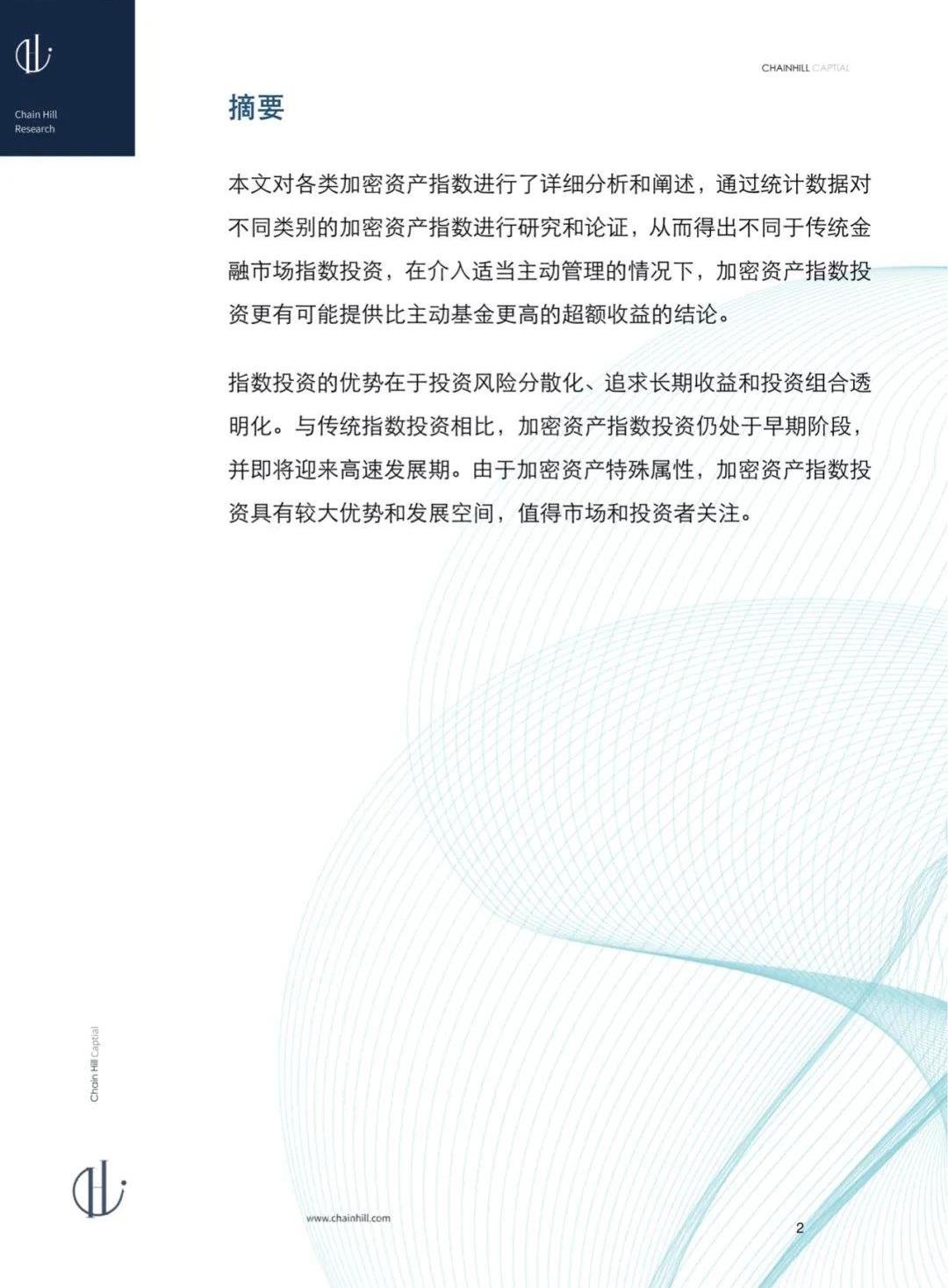 本文系ChainHillCapital仟峰资本管理合伙人Carrie独立撰写,未经授权严禁转载,转载、获取PDF完整版等事宜请联系ChainHillCapital仟峰资本公众号。本文对各类加密资产指数进行了详细分析和阐述,通过统计数据对不同类别的加密资产指数进行研究和论证,从而得出不同于传统金融市场指数投资,在介入适当主动管理的情况下,加密资产指数投资更有可能提供比主动基金更高的超额收益的结论。指数投资的优势在于投资风险分散化、追求长期收益和投资组合透明化。与传统指数投资相比,加密资产指数投资仍处于早期阶段,并即将迎来高速发展期。由于加密资产特殊属性,加密资产指数投资具有较大优势和发展空间,值得市场和投资者关注。以下为正文部分: