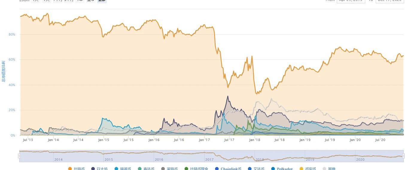 来源:CoinMarketCap-总市值比例在全球疫情仍充满不确定性,各大资本市场几乎都陷于剧烈的波动与震荡之中的2020,比特币给我们交了一份很好的答卷,成为一道靓丽的一道风景线。顶尖历史学家尼尔·弗格森在《巴伦周刊》表示:在一场流行病疫情中,金融可以加速。我们已经看到,就像黑死病加速了硬币作为货币的使用一样。而在全球针对疫情的疫苗供应不足之下,比特币作为内在稀缺性的数字资产,市场已然把它作为一种新的资产形式,在多元化的投资组合中占有一席之地。我想,在多年后的回首时,或许我们会怀念比特币的这个价格,这恰如我们当初看向比特币之时。