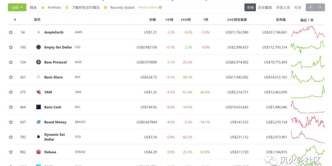 特别注明:这位阿姨和风火轮社区无任何关系。ampl之后也不出意外的冒出了很多仿盘,几个月过去也出现了一些改进币,形成了算法稳定币板块,今天呢,咱们就蹭下这个热度,来聊下市面上这类项目,看看它们之间有什么差别。算法稳定币,也有人称它为弹性加密货币,无抵押稳定币,都是一种哈,它的一个目标是希望能解决稳定币市场的痛点。稳定币,如果你有看我们前两篇内容,应该多少会理解稳定币对加密世界的重要性,可以说我们几千亿的市值是有很大一部分构建在稳定币上的,但很多人会说像USDT这种中心化不透明,也有监管风险,而像DAI这种通过抵押物来生成的,又存在一个连环清算风险。那有没有可能说,我们通过机器算法智能合约去做一个锚定法币价值的币呢,如今的算法稳定币就是这个方向的一种尝试。要说起算法稳定币的机制,一定要了解一个词:rebase,即通过更新流通量使得市场价格趋于目标价格。大部分项目的设定是,当币价>1.05美元(这个标准每个项目也略有不同),认为市场的需求增大,根据币价来增发一定比例,来抑制市场价格。当币价<0.95美元时,认为供过于求,缩减一定比例,以提升价格。通过多次反复rebase,使得币价趋近于美元价格。对于投资者来说,此类币种的重点不在低买高卖,而在于当价格进入一种微通胀正循环后,连续增发产生的复利,可能你看到币价一直在1.1,1.2U但背后持有者的资产价格已经翻了五六倍,所以这类项目,需要更多关注市值波动而不只是价格。要了解现在市面上的算法币,可以从coingecko下面这个链接查看:https://www.coingecko.com/zh?category_id=rebase-tokens&view=market