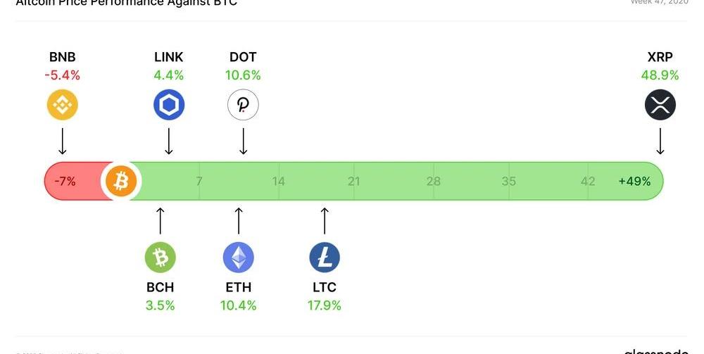 相对于BTC的表现除了BNB之外,在整个第47周主流山寨币相对于BTC的表现都很好。XRP的涨幅最大,增长了近50%,其仅次于比特币。