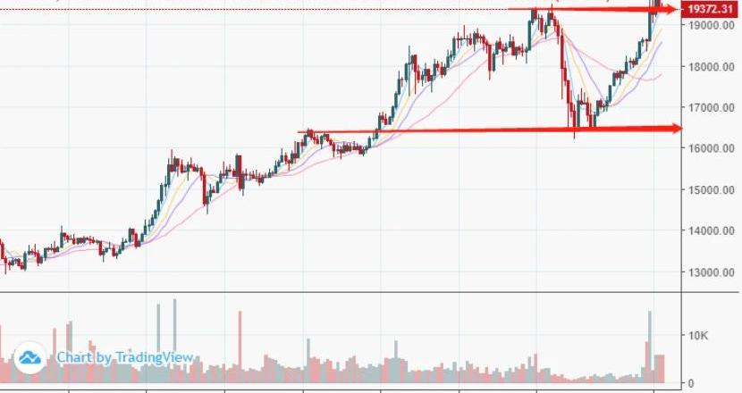 Bitcoinwin数字货币最新行情显示,昨夜晚间BTC连续冲高至19850后开始震荡下跌,截至撰稿,BTC在Bitcoinwin上的报价为:19372美金。从Bitcoinwin的行情上了解到,上周BTC触及19485后便开始一路下跌,最低跌至16200一线,跌幅达15%之多。随后周末两天,行情有所回暖,BTC价格逐步攀升,由底部16200开始拉升至目前的19372美金附近,仅仅三天左右时间,完全收复上周大跌空间,并成功反包,再度创下年内新高19850美金,距离2万美金仅仅一线之差,触手可及。