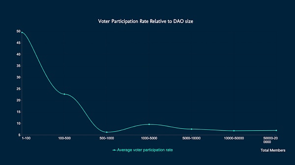 DAO 的规模越小,选民参与率就越高。根据下图我们可以注意到,DAO 的规模越大,通常参与率更低。造成这个现象主要的原因是,它们通常是一些主要的大型协议 DAO,其中集体决策目前仅限于边际问题。