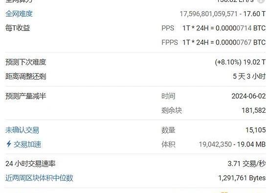 此外,BTC.com数据显示,当前比特币全网算力为138.82EH/s。当前挖矿难度为17.60T,距离难度调整还有5天3小时,预计下次挖矿难度将上调8.10%至19.02T。