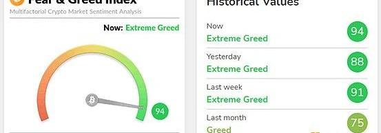 那么当前的比特币市场情况如何呢?自10月中旬以来,比特币价格从10,000美元左右跃升至目前的19,000美元左右。市场上很多人都对比特币抱有十分乐观的预期,认为比特币在年末可以冲上8万、10万美元;另一方面,在调研市场时,发现有不少投资者开始使用信用卡或者通过贷款投资比特币,这是十分危险的行为。从比特币贪婪指数看,目前已经达到94,市场处于极度贪婪狂热的状态。特别是从历史数据上看,自11月中旬以来,比特币贪婪指数就一直处于90左右的高位,这是一个相当危险的信号。从上面的分析就可以看出,11月26日上午的比特币大跌并不是突如其来,实际上早有迹象可循。