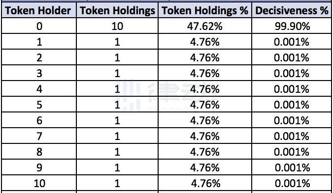 在第三种分布下,共有10名持币者,持币者0拥有52.63%的总代币量,其余持币者各拥有5.26%的代币。在这种情况下持币者0对协议有着绝对的控制权,其决定性为100%。其余持币者对于协议没有任何决定性。治理代币分布四:绝对决定性