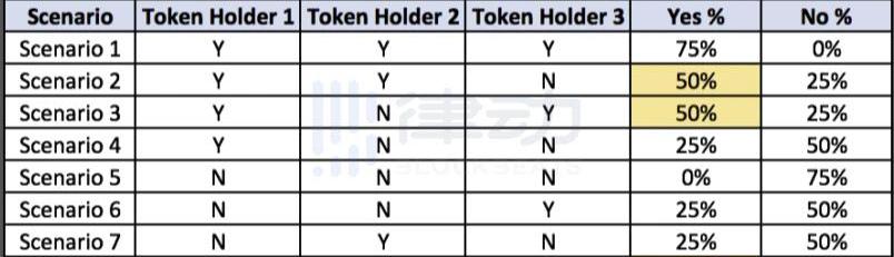 在此代币分配比例下,每个持币者各占有25%的投票权,每个持币人的决定性为37.5%。在这篇名为《Agovernancevaluationframework》的文章中有详细阐述计算决定性的公式。为了便于理解,我们可以将可能发生的票型情况一一列举,并从一个持币人的角度进行分析,在此案例中我们选择了以0号持币者视角来分析。对于其他三位持币者来说,可能出现的票型数量为:2^3=8。