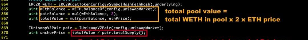 抬高CHEESE的价格在这一步中,攻击者通过重置喂价预言机来操纵UNI_V2LP凭证的价格,从下列公式可知,UNI_V2LP的价格受到流动池中WETH的数量和UNI_V2-USDT-ETH池中ETH价格的影响,即WETH*2*ETH的价格=LP总价,LP单价=LP总价/LP总供应量,当攻击者将增加池中WETH的数量时,UNI_V2LP凭证的价格也会上涨。