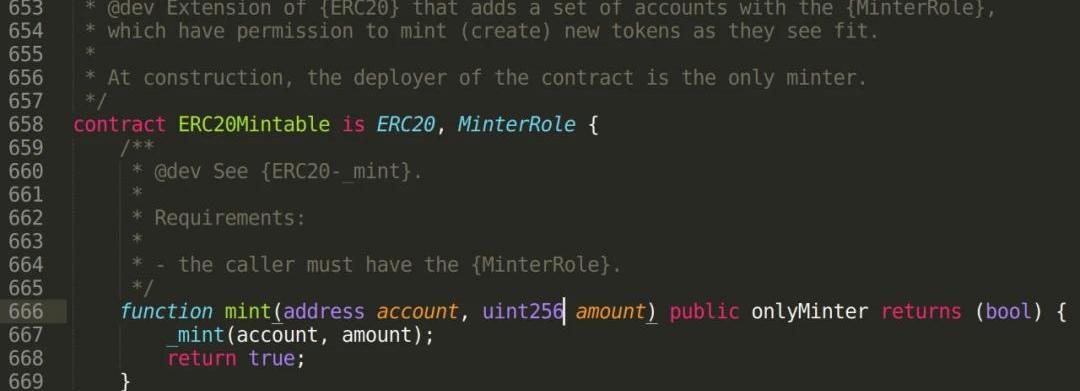 图二:WALTToken智能合约mint()函数图二为遭受内部操作攻击智能合约中被恶意调用的函数mint()。从666行的代码实现中可以看出,任何拥有minter权限、可以通过onlyMinter修饰符限制的外部调用者均可以调用该函数。该函数的作用是通过667行代码向任意账户铸造任意数目的代币。通过图三中619行onlyMinter修饰符的逻辑实现,以及615行构造函数中给与智能合约部署者minter权限的逻辑实现,智能合约部署者拥有了可以执行图二中mint函数的权限。