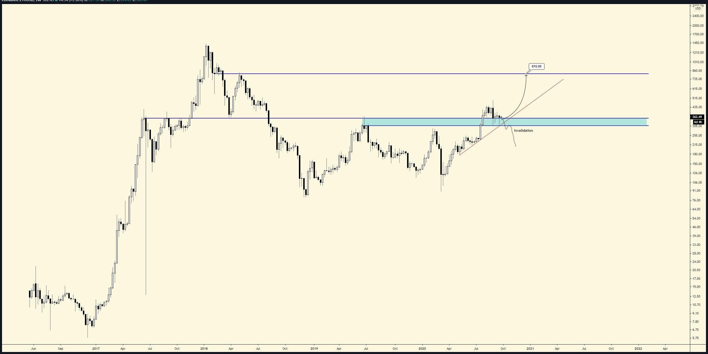 9月,一位名叫“CryptoCapo”的匿名交易员和图表专家在推特上发布了一张ETH周图,概述了两种可能的情况。看跌的情况表明,投资者拒绝接受360美元的支撑位,随后出现大幅下跌。看涨的情况表明,确认360美元为支撑位,并有可能冲向800美元。