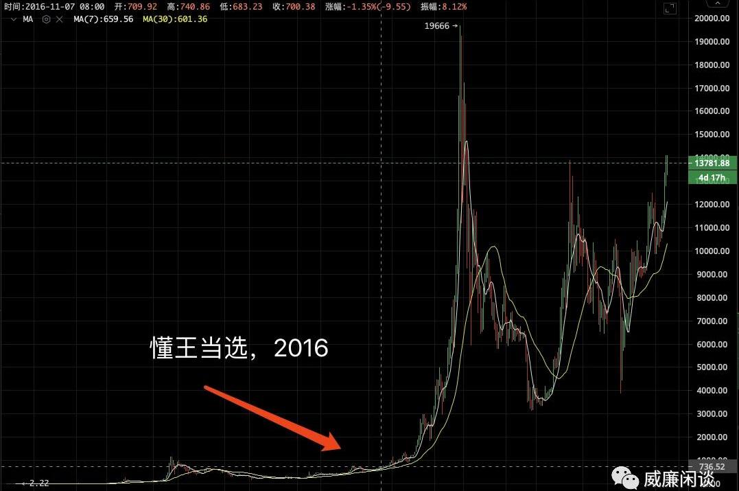 市场喜欢一个不顾一切只为了股市接着涨下去的人,我们也喜欢。就好比有两个庄,一个庄只吹牛不拉盘,一个庄又吹牛又拉盘,你喜欢哪个庄?显而易见嘛。其次,印钱肯定是接着印的嘛。不管谁上都是印钱,但是懂王印钱不全世界打架,不到各个地方捐钱,不全世界撒钱,就拿来拉盘和空投,最后都会直接反馈到金融市场上,这不是挺好的?今年比特币的确跟主流市场跟的挺紧的,所以如果主流市场能好的话,咱也查不到哪儿去。尤其是今年大饼显然“美元本位”明显了,美元指数与比特币呈现比较明显的负相关。大量印钱,并且能趾高气昂地指着美联储的鼻子逼他们印钱的,也就只有懂王了。能不利好嘛?最后,咱再刻舟求剑一下,这是他上一次当选之后的比特币走势:
