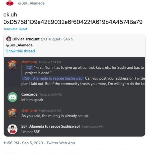 上图是多重签名钱包的所有权变更交易,资料来源:Etherscan那么问题来了,“0xD57581”开头的地址所有者是谁的?如果我们在社交媒体Twitter上搜索这个地址,会发现Nomi大厨的Twitter账户@Nomichef曾与加密货币衍生品交易所FTXExchange首席执行官@SBF_Alameda在Twitter上发生过一次“有趣”的交流: