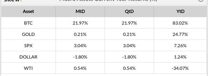 比特币与标准普尔500滚动相关性图来源:AnthonyPompliano/TwitterPompliano继续指出,自今年3月冠状病爆发以来,比特币的回报率超过了宏观资产。他总结道:“那么,在经济衰退期间,比特币的表现如何?它的表现超过了股票、债券、黄金、石油以及几乎所有其他资产。在任何重要的时间内,比特币与宏观资产的相关性都很低,甚至没有。”比特币是终极的安全港,市场正在证明这一点。据Skew的数据证实,BTC/USD大约是13150美元,为投资者提供了今年迄今为止83%的回报率,而黄金为24%,标准普尔500指数为6%。在Pompliano看来,之前比特币与这些资产之间的相关性仅仅是3月份的事件引起的一个短期现象。他写道:“在流动性危机期间,所有资产的相关性都趋向于1。这是暂时发生在黄金,股票等领域的事情。”