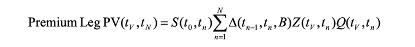 溢价阶段是违约互换利差到期或到信用事件发生时的一系列支付行为,以最先发生的为准。它也包括从先前的保费支付日期至信用事件发生时累计的保费。假设有n=1......N合约付款日期,其中,tN是违约互换的到期日。用S(t0,tN)表示tN年期合约违约互换价差,忽略应计保费,我们可以将现有合约保费段的现值写为: