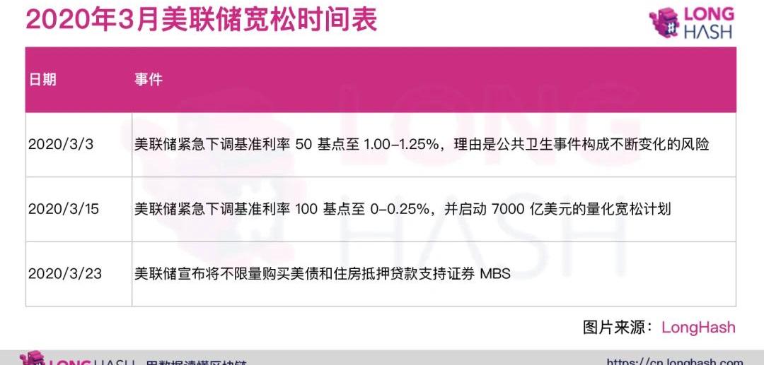 短期的事件经常引起市场价格的剧烈波动,但对市场中长期的影响更需要关注基本面和货币政策层面。今年全球遭遇新冠疫情大流行,为了解决流动性危机和刺激经济,美联储向市场大量注入美元流动性,引起了包括数字货币市场在内的全球金融市场的巨大波动。在布雷顿森林体系解体之后,美元和黄金脱钩,其他各国的汇率自由浮动,但是,由于美元在国际贸易和国际外汇储备中占据主导性地位,美元实质上依旧是承担着世界货币的职能,美联储也实质上成为了世界央行。因此,美联储的重大的货币政策通常对金融市场具有指标性的意义。下图是美联储在今年3月应对由新冠疫情所引发的经济衰退而采取的一连串非常夸张的措施的时间表。