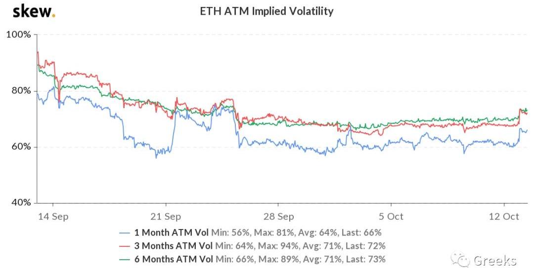 ETH历史波动率10d43%30d69%90d85%1Y103%以太坊今日期权持仓量3.91亿美元,成交量3700万美元。各标准化期限IV:今日:1m65%,3m72%,6m74%10/12:1m60%,3m67%,6m70%