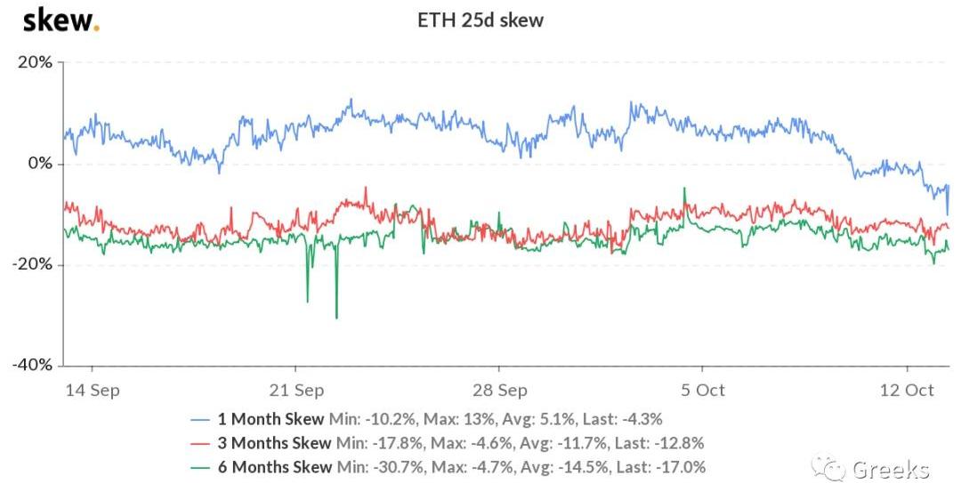 近两日put成交量很大,但是都是短期买入影响有限,所以期权IV持续稳定。由于价格在上涨后进入宽幅震荡,比特币期权的偏度skew小幅上涨。