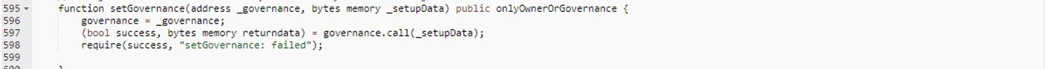 据上图所示,调用该方法可输入两个参数,即一个地址类型的“_governance”和一个bytes类型的“_setData”。而函数的governance.call(_setupData)其实是表示向参数“_governance”地址发起一笔交易,其calldata为参数“_setData”。如此一来,只要有权限调用这个方法,便可以借合约的身份发起任意交易。在进行代码编写时,其注释表示此函数是一个修改治理合约的函数,如下图所示: