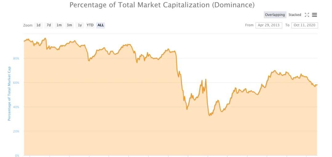 顺便一提,根据CoinMetrics数据,以太坊第三季度网络总交易费高达3.18亿美元,是同期比特币网络交易费用的3.5倍;并且,3.18亿美元也是以太坊前两个季度交易费用之和的7倍多。过去一个季度,比特币在总市值中的占比下降明显,从季度初的64.78%,最低跌至55.95%,最大跌幅13.6%;这也是自2019年第三季度起,比特币占比首次跌下60%,此前备受期待的「山寨季」或许正在来临。