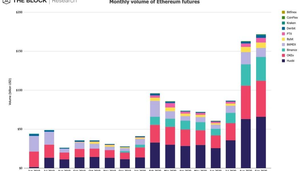 与比特币相比,以太坊却在第三季度获得青睐,期货交易量不断突破历史新高。根据Skew和TheBlockResearch数据,9月以太坊期货的月度交易量增长了5.3%,从1631亿美元增至1722亿美元,创下新的历史记录。