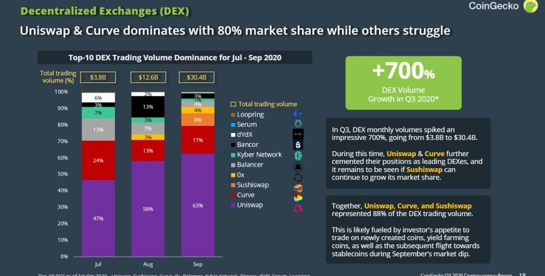 据CoinGecko数据,排名前十位的DEX三季度交易额增长率达到700%,九月当月交易额约为304亿美元,远超中心化交易所,同期中心化交易所增长率仅为70%。在DEX中,Uniswap市场份额占比为63%,Curve市场占比为17%。