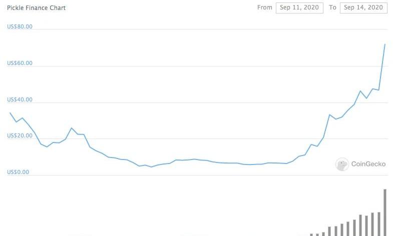 今天,一个叫PICKLE酸黄瓜的新DeFifarming项目受到关注。CoinGecko数据显示,截至9月14日13:30,PickleFinance链上锁仓已突破1.7亿美金。PICKLE日交易量已达4200万美元,现报64.59美元,24小时涨幅884%。自最低点4.4美元至今,两日间最高涨幅已达到1832%。