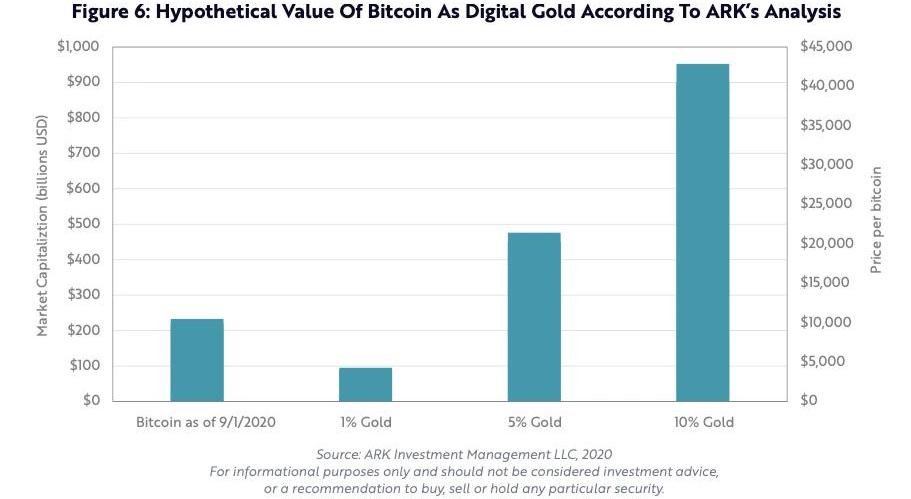 作为向数字经济转型的一部分,比特币可能会挑战黄金作为全球价值存储的地位。经济史表明,当资产的需求相对于供给增加时,资产就会产生价值。需求是资产发挥货币三种作用的能力的函数,即价值存储、交易媒介和记账单位。几千年来,世界公认黄金是最持久的货币形式。在自然选择的过程中,各种商品相互竞争,争夺主导地位,直到黄金发展成为全球货币标准。虽然黄金一直保持着其作为价值存储的地位,但其作为交换媒介和记账单位的局限性在20世纪开始浮现。支持者经常将比特币称为数字黄金,因为它改进了实物黄金的许多特性。比特币不仅稀缺、耐用,而且它还可以分割、可验证、可携带、可转让,所有这些都可以避免中心化的威胁。根据我们的研究,如果在实物黄金市场上占据10%的份额,比特币的网络价值可以增加近1万亿美元,如下图所示,是如今2000亿美元基数的5倍。