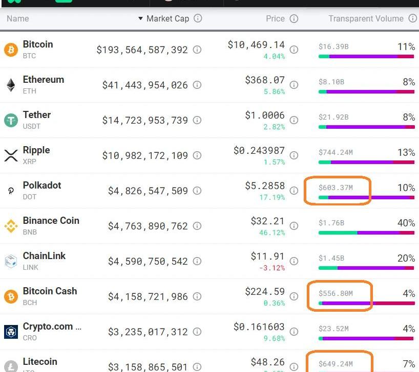 对于很多加密货币专家和投资者来说,市值和“大反转”是价值的重要反映。任何从2017年开始参与加密货币的人,都会想起围绕ETH和BTC翻转的激烈讨论,同样的骚动在BCH和EOS进入市值前5名时也出现过。现在,交易者们的注意力又转移到了波卡这个项目上,因为该网络目前的估值已排到了前5位,而且其排名上升的速度似乎也是出乎意料的。与以太坊类似,波卡的目标是成为一个去中心化的应用网络,而该项目的主要贡献者,便是前以太坊联合创始人GavinWood。尽管DOT代币在各大交易所上线还不到30天,但即便是对于专业交易者来说,它也是引入注目的。有趣的是,其每周6亿美元的透明交易量与BCH、LTC等老牌加密货币不相上下。此外,DOT的价格变动,似乎要比ETH提前15分钟-4小时。