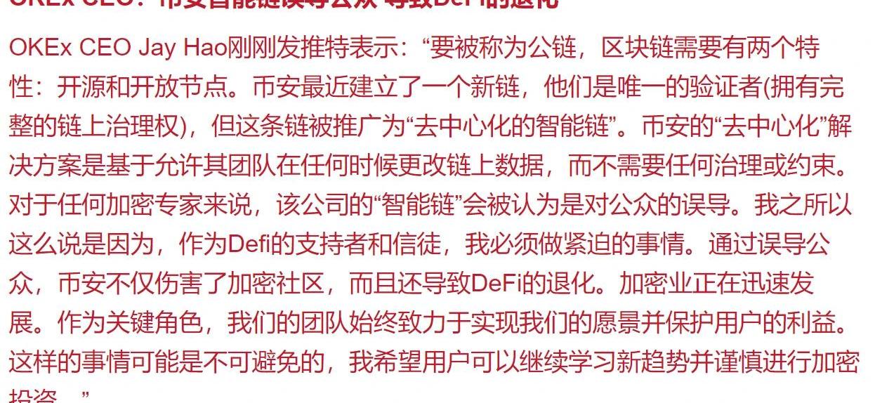 根据OKEx的介绍,主要有八大特色,看性能也是挺齐全的,当然具体情况有没有他们说的这么好,也是需要抱着谨慎的角度去看待,最好还是先以小成本试一下再说。币安也不遑多让的推出了“智能链”,根据币安对“币安智能链”的介绍,大致为币安智能链将作为币安链的平行链运行,实现智能合约创建以及BNB质押挖矿等功能,同时支持个人和/或机构收集BNB委托并成为这一新区块链的验证节点。此外,币安智能链社区本月将推出更多实用性工具,为加密资产发行、转移、BNB质押挖矿、dApp创建及使用等功能服务。另外,在9月11日「TheWorldofDeFi」线上峰会上,币安创始人兼CEO赵长鹏宣布,将设立一亿美金种子基金扶持行业生态建设,打造CeFi与DeFi生态协同。看起来双方都是为了新上线的DeFi业务下了血本。原本事件就这么和平的发展,两大交易所的平台币也是你来我往的上涨,但随着OKEx的CEOJAY在推特上对“币安智能链”的一番抨击,事态变得有趣了起来。