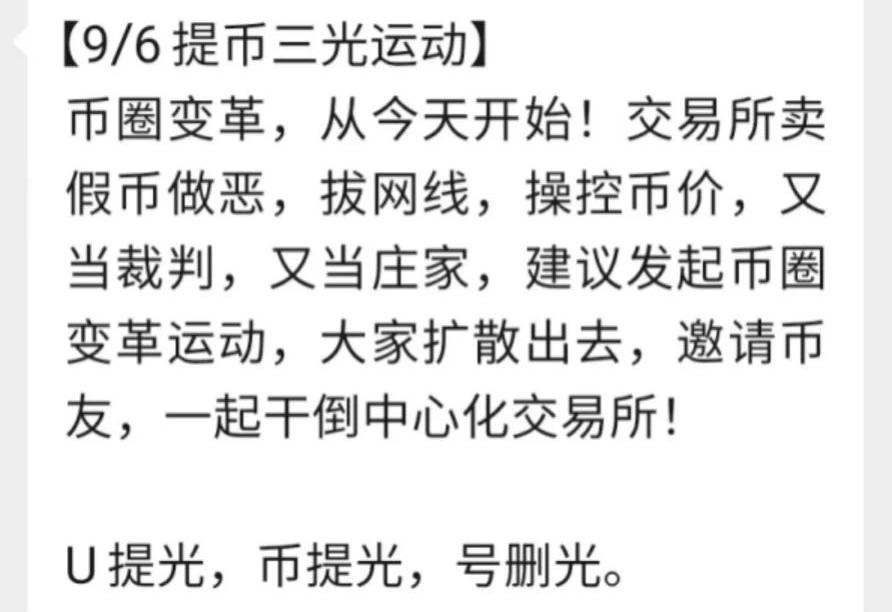 提币运动口号就这样,声势浩大的提币运动拉开了序幕,各种社群喊着统一的口号,声称要提光交易所的代币。“提币运动是为了自己的利益而战,没有退路,我们以提光交易所代币为荣。”一位参与了提币运动的用户告诉深链DeepChain,他将交易所里的大部分比特币和以太坊提到自己的钱包里。在这场提币运动中,YAM社区最快加入进来。有用户发现,某交易所的挂单代币数量超过链上该交易所所持有的代币。在社区的号召下,用户将代币提到钱包,最终交易所也暂停了提币,币价很快就开始上涨。随后其他几个流动性挖矿的项目,珍珠,胡萝卜,三文鱼等社区也加入进来。这些项目流动性很低,如果用户集中提币中,而交易所缺乏代币时,就不得不去Uniswap上购买,从而刺激币价的上涨。然而,交易所们也不会甘心被用户骑在头上,很快就做出了反击:利用"钱包维护,暂停提币"等原因去禁止用户提币。之所以交易所的反应如此激烈,或许是因为这次的提币运动,出乎了交易所门的预料。也许,一开始的他们以为这次提币运动,和此前的一样。提币运动兴起,直击交易所“恶行”