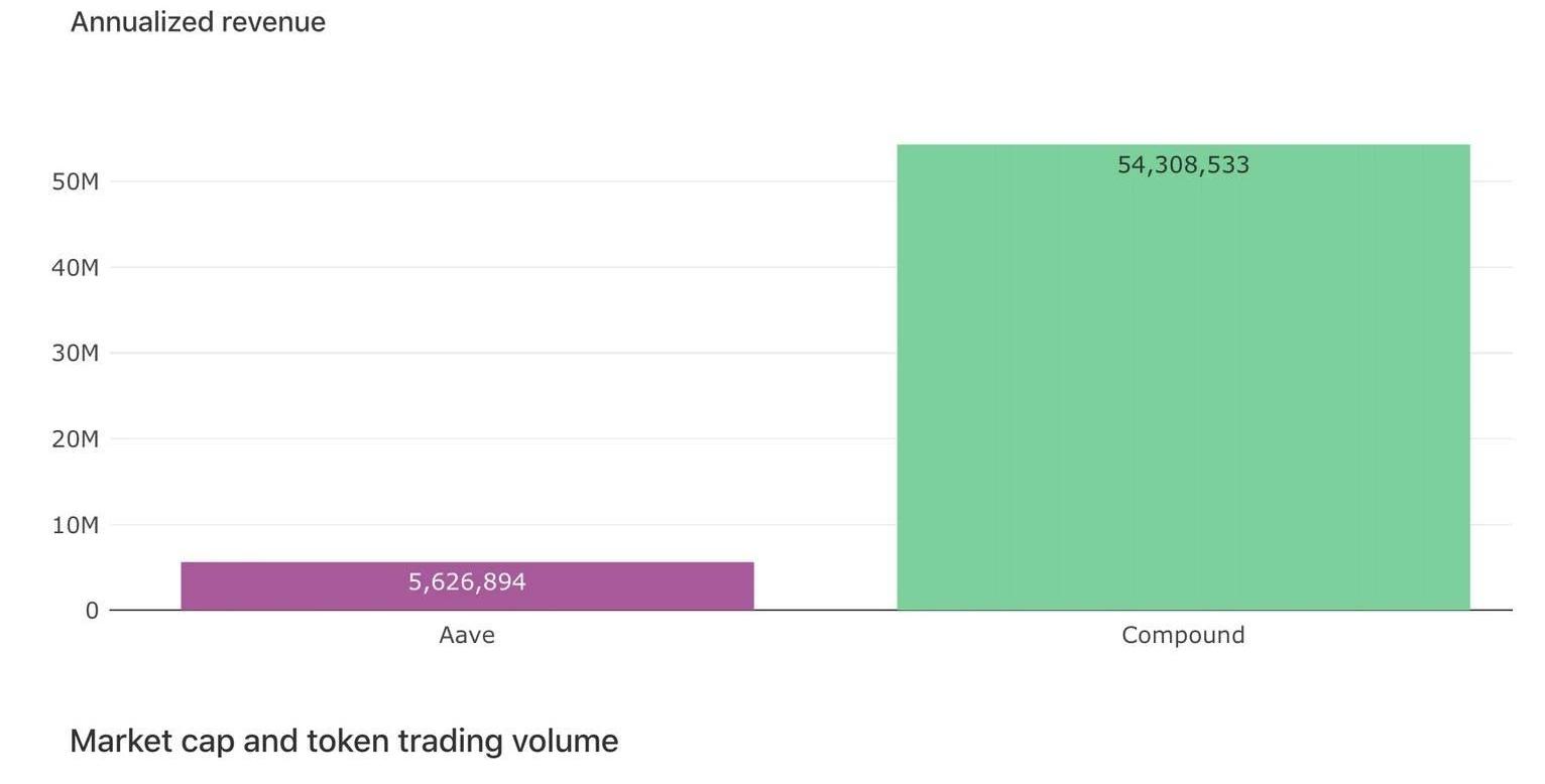 上面是关于Balancer的一篇重要推文,在很多人都在尝试分叉Uniswap的时候,Balancer取得了相当大的增长。Balancer已进行了较为成功的流动性挖矿活动,虽然可调整的投资组合权重通常被视为它的杀手锏,但设置定制费用的能力对流动性提供者来说同样具有吸引力。比方说,一些波动性较大的资产池会收取高额费用以弥补无常损失,而UMA则为其yUSDOct20代币推出了一个激励池,而这个池子的收费仅为0.01%。本周图表:Aave和compound