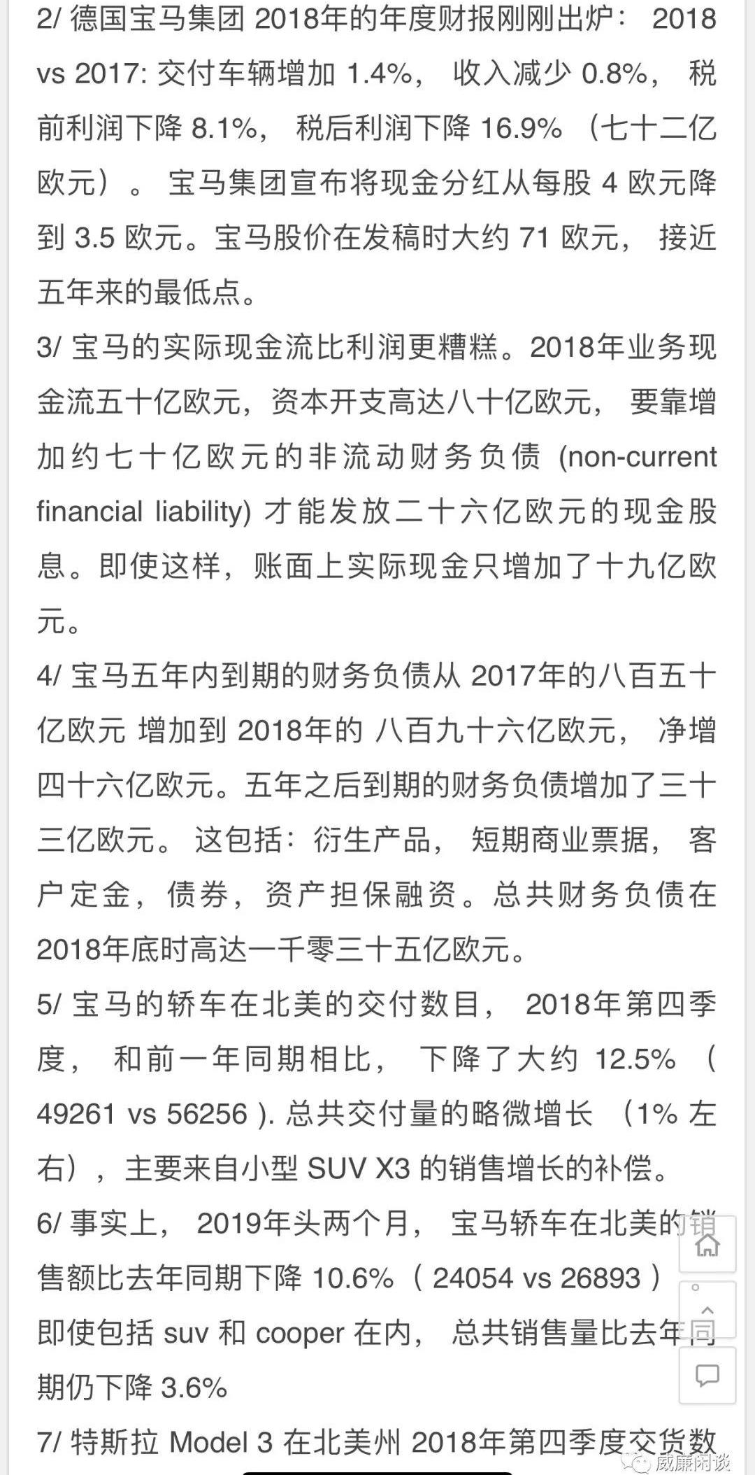 开个玩笑,应该说还好这回试驾的主角是我朋友,接受销售“洗脑”的不是我,不然真的就一定控制得住了。不得不说这个介绍过程,真挺吸引人的,不过我今天不是要聊它多好,而是要聊一下它跟其他品牌的不同。在这之前,我试过的汽车牌子也不多,奔驰奥迪保时捷,就这三个。有一个最大的差别,在我看来,就是我从头到尾没听到一句关于“特斯拉品牌文化”之类的介绍,其他三个牌子,几乎离不开品牌文化,底蕴和背书。当然,我们的确也是奔着这个去的嘛,没啥好掩饰的。我不是一个汽车发烧友,就是一个普通消费者,所以我对车子的理解反正就是牌子—样子—里子,这么一个顺序。但是特斯拉的销售基本也不介绍牌子和样子,只拉着你玩各种各样的新功能,智能驾驶之类的,智能这智能那儿。总之,我体验下来感觉就是,我看的不是传统意义上的“车”,而是一个大号的电子产品。从头到尾就是觉得“这挺好玩,这也挺好玩”,哈哈。真的挺有意思的,对于年轻人来说诱惑力真的很大。其他牌子每年花一大堆钱在品牌文化建设上,在销售渠道上,在各种广告营销和人员费用上。结果特斯拉全部自己来了,用互联网的打法打线下,那可不就碾压么。降维打击。我记得18年的时候看到王川的一个帖子,说是特斯拉会让宝马提前破产,帖子内容是这样的: