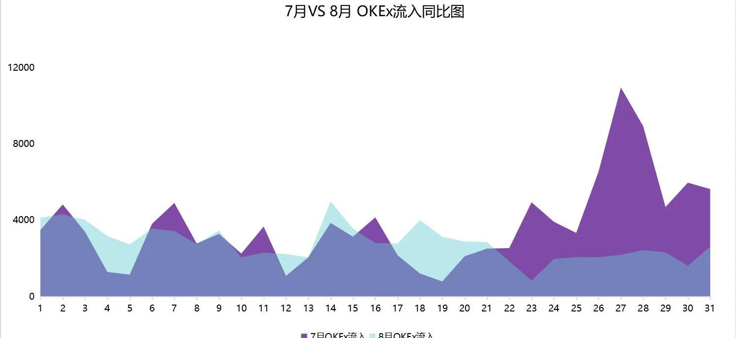 就8月数据来看,币安交易所比特币流入比7月上涨0.99%,流出比7月上涨3.98%,净流入比7月下降73.59%。可以说,7月比特币价格的大幅上涨,币安净流入也随之上涨。8月币价稳定于11000美元左右后,资金选择产生“分歧”,币安净流入数据因而无太大提升。
