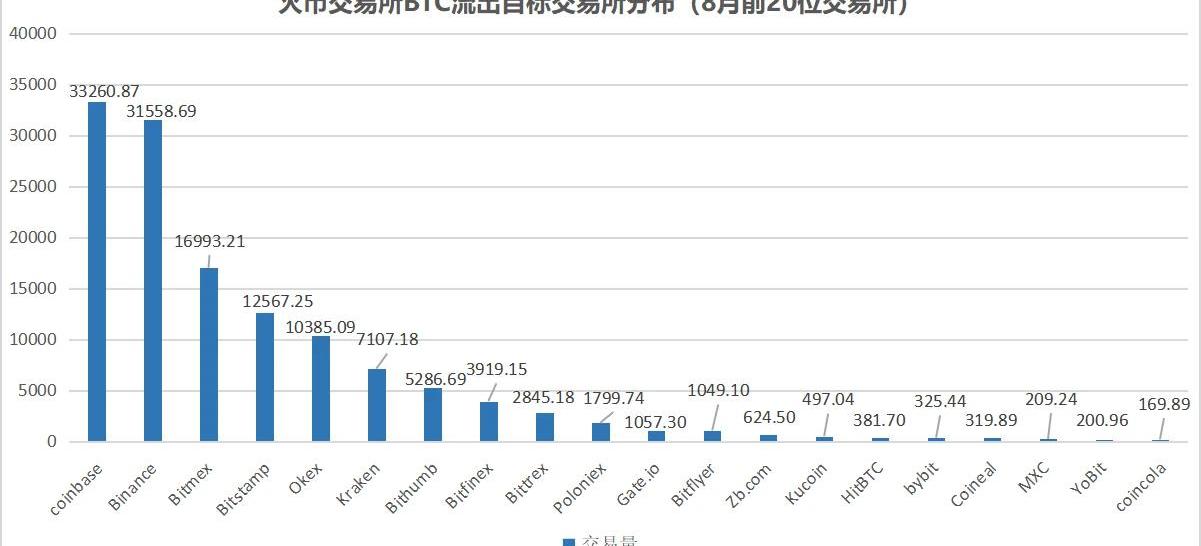 Huobi流出的比特币主要去向中,coinbase、Binance、Bitmex位居前三,coinbase反超币安在火币交易所流出的比特币去向中占据第一,相较于7月,火币流向coinbase和币安的比特币都有所下降。