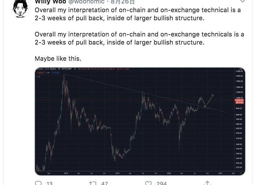 尽管比特币在近期遭遇下跌,但加密货币社区内有很多人依然保持乐观态度。“10000美元是新的1000美元,”比特币和加密货币分析平台CryptoCompare首席执行官CharlesHayter提出了他的观点,他还补充说:“随着过去三年的发展,2020年整个生态系统的基础设施、监管和恢复力方面都取得了飞跃性进展。”Hayter认为,目前的比特币市场与2017年上半年非常相似。比特币购买应用Swanbitcoin首席执行官CoryKlipsten则通过电报表示:“在2020年的大部分时间里,比特币的短期价格走势与美国股市高度相关。”此外,他还预计称:“任何跌破10000美元的价位,都是贪婪买进的好机会。”此外,链上分析师WillyWoo在一周前便预测称,9月份的前两周,比特币将会经历回调,但在之后依旧会重回上升趋势。