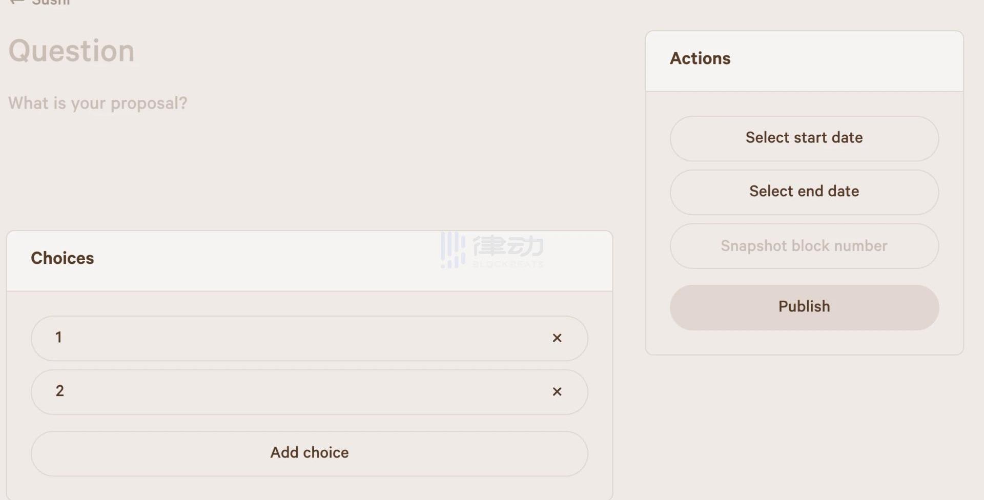 FTX创始人参与Sushi多签的社区投票右上角显示了投票代币名称、起始截止日期、IPFS和发布时快照等信息,下方为当前投票的数据除了投票,用户也可以发起社区提案,律动BlockBeats观察到Snapshot提案界面提供自定义投票样式和提案相关的规则。同样用户创建提案也是免费的,无需交易。