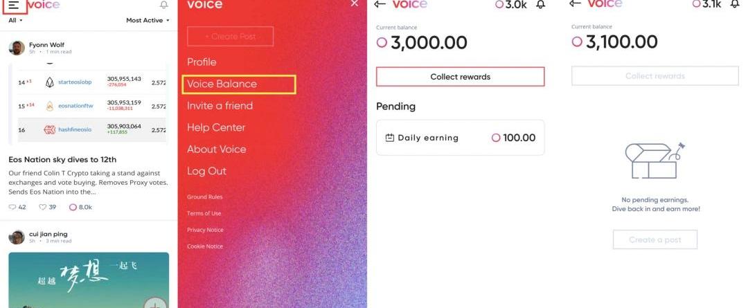 第五步,完成上述步骤,你就可以使用以上用户名和私钥登录Voice,正常发布文章,点赞并获得voice了。对了,系统会先赠送3000个Voice,点击右上角,打开「VoiceBalance」,再点击「Collectrewards」,就可以领取了。除此之外系统每天还会赠送100Voice,也以同样方式领取哦~