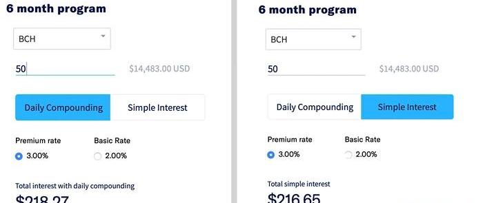 3、另一个较受欢迎的计息账户平台是Cred,他们允许人们按月赚取利息,用户也可以每天赚取复利,而且还能抵押比特币、以太坊、比特币现金、LINK、USDT和大量其他加密货币。目前Cred业务覆盖了全球196个国家/地区的60,000多名客户,并承诺提供超过2亿美元的加密资产。Cred网站上还提供了一个“计算器”个性化服务,可以根据用户选择的加密项目计算他们可以赚多少钱。举个例子,如果用户选择六个月期间项目并认购50BCH,再选择3%“每日复利”,那么该用户每天可以获得218美元的净复利总收益。
