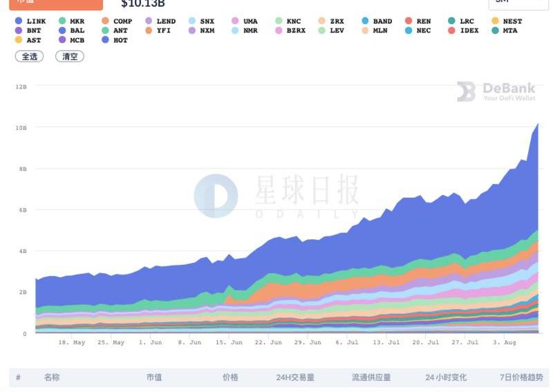 数据:DeFi项目总市值突破100亿美元,LINK占比过半DeBank数据显示,当前DeFi项目总市值突破100亿美元,约101.3亿美元。其中,LINK市值超过51.36亿美元,占总体份额50.71%;MKR市值超过5.26亿美元,占总体份额5.2%;COMP市值超过5.19亿美元,占总体份额5.13%。注:"DeFi项目市值"是衡量一个DeFi项目估值的指标。计算公式:DeFi项目市值=DeFi项目代币价格x代币流通供应量。