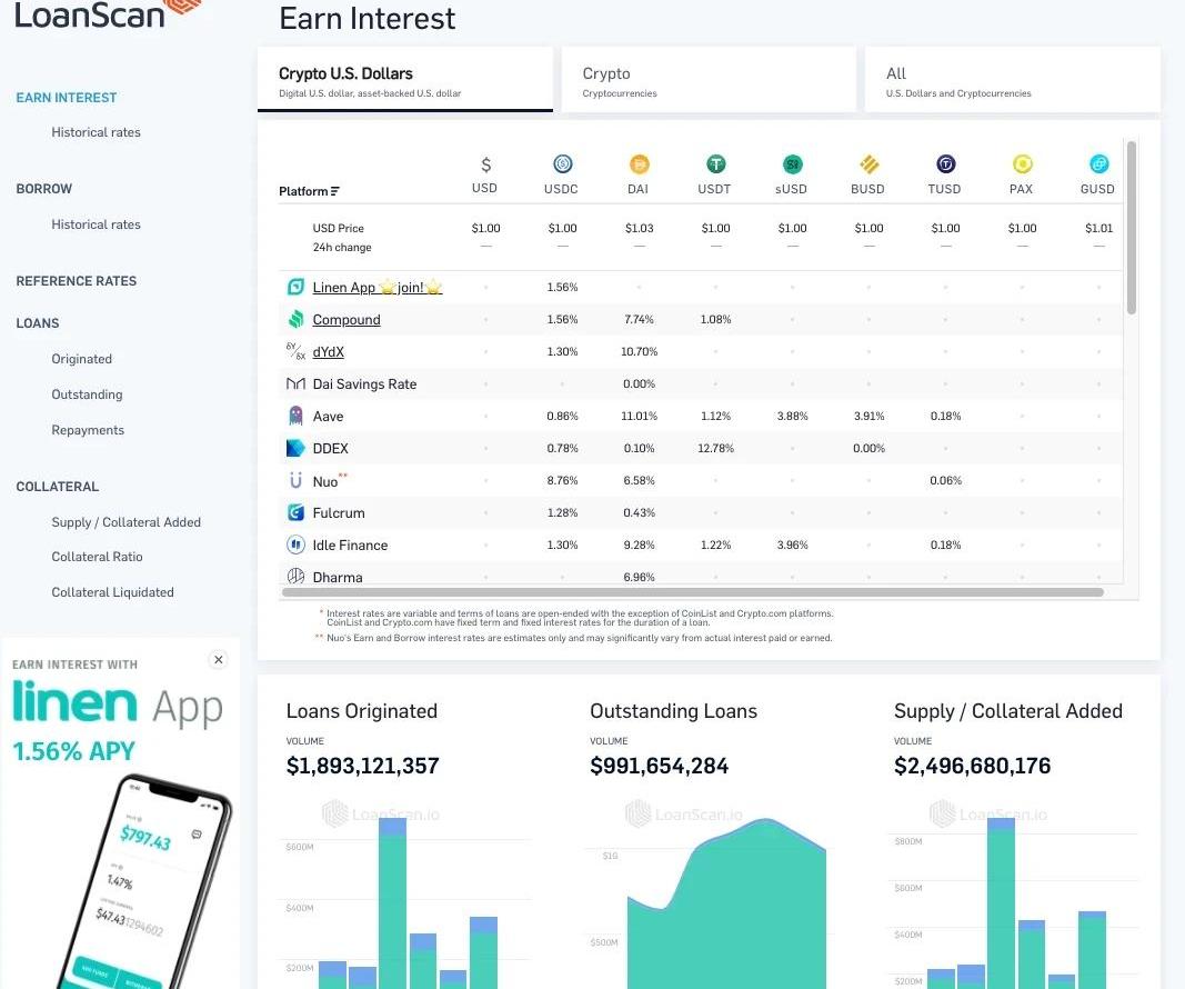 网址:https://loanscan.io/LoanScan显示以太坊区块链上发行的所有债务的信息。向用户展示了获得单个加密货币最高利率的最佳平台。用户在LoanScan可以找到最佳赚取高利息的平台,也可找到最优惠利率借款的平台。还能显示所有贷款的来源和未偿贷款总额。8.DaiStats