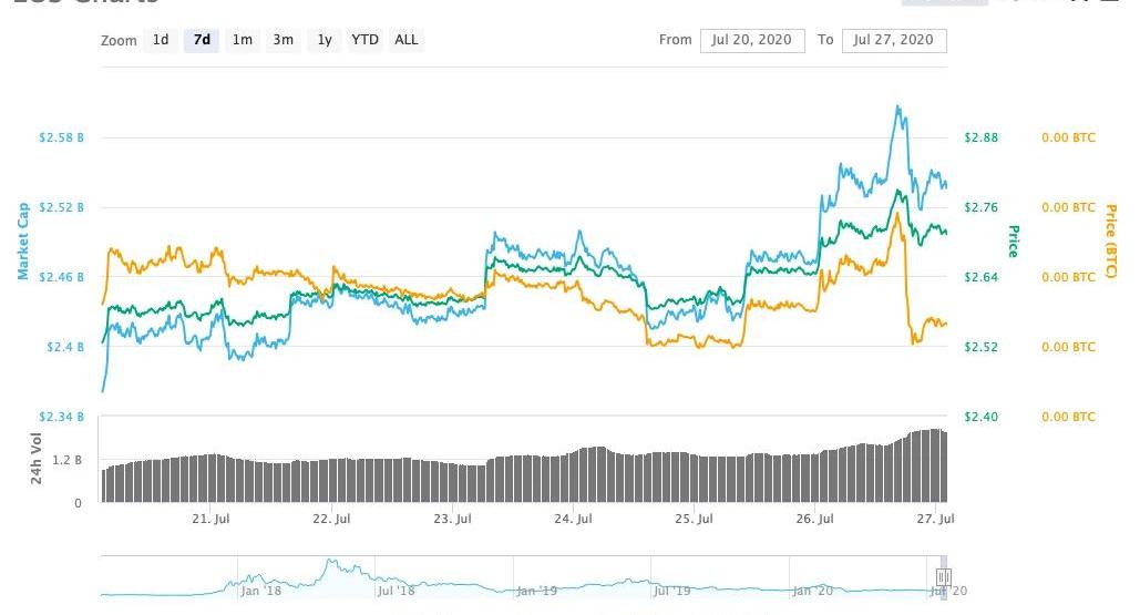2、项目动态Block.one完成了新一轮的EOS节点投票最近,Blockone已经完成了新一轮的EOS节点投票。B1投票的节点有:atticlabeosb,big.one,binancestake,bitfinexeos1,blockpooleos,eosasia11111,eoscannonchn,eosdotwikibp,eoseouldotio,eosflytomars,eoshuobipool,eosinfstones,eosiomeetone,eosiosg11111,eoslaomaocom,eosnationftw,eosrapidprod,hashfineosio,helloeoscnbp,newdex.bp,okcapitalbp1,slowmistiobp,starteosiobp,whaleex.com,zbeosbp11111。VOICE宣布用户可以进行人工注册,无需KYCVoice团队宣布了其平台上新的人工注册流程,这将取代之前准备使用的KYC。该消息直接来自Voice团队在推特上发布的帖子。人工注册将允许用户通过具有生理特征的照片进行注册并验证,取消了此前要求的驾照、身份证以及护照等验证过程。据了解,这类3D图像类似于iPhone上FaceID使用的图像,并存储在Voice的安全服务器内部,任何第三方公司都无法访问。通过推出新的人工注册,Voice用户未来无需用法律意义上的姓名进行注册,这或许让Voice的用户增加更多可能性。已经使用法定姓名注册的用户将来应该可以对其进行更改。3、社区、节点动态Newdex正式宣布投资Defibox,助力Defibox孵化全球领先的去中心化交易所Newdex官网消息,Newdex正式宣布投资Defibox并提供孵化支持。Defibox将于2020年7月21日正式上线,并将在2020年7月24日开启挖矿。Defibox是EOS上专业的一站式DeFi应用平台,由Defibox基金会发起和管理,同时获得Newdex投资和孵化支持。项目将于2020年07月21日上线,致力于成为EOS用户最广泛使用的DeFi应用平台。目前Defibox已推出两个协议,分别是Swap闪兑、USN稳定币,未来还将陆续推出更多协议,如:去中心化借贷、合成资产等。EOS去中心化交易所eosfinex即将发布eosfinex是由Bitfinex推出的EOS去中心化交易所。它之前是搭建在bitfinex创建的EOS侧链上的,而现在,eosfinex要运行在EOS主网上了,即将要发布的就是EOS主网Beta版本。eosfinex表示:“与Bitfinex的整合将使eosfinex成为世界上流动性最高的非托管数字资产交易所,并标志着可以解决非托管数字资产交易中流动性不足的关键里程碑”。4、新闻动态BSN宣布完成与以太坊、Nervos等6大公链整合7月21日,国家区块链服务网络BSN宣布完成与Tezos、NEO、Nervos、EOS、IRISnet和以太坊6个公链整合。从8月10日起,这六个区块链上开发人员将能使用BSN海外数据中心的数据存储和带宽来构建DApp并运行节点。全球用户将通过BSN跨链结构、以及与中国银联合作关系,访问国内企业链和财务数据。本次6个区块链项目是第一批整合去中心化公有链,BSN将在其位于巴黎,旧金山和香港的三个数据中心的网络上提供运行支持,预计在2020年底之前根据用户群、技术背景和产品等条件把公有链整合数量提升到10个以上。EOS成为拥有最多游戏用户的公链,排名前十中占了四席根据DappRadar显示的数据,就日活而言,排名前10位的区块链游戏中有4个在EOS上运行。这肯定了EOS成为智能合约区块链游戏中的地位,让dApp可以提供简洁直观的游戏体验,而玩家无需担心资源或费用。在EOS上可以找到的排名前4的游戏分别是:Splinterlands:“属于PVP体验,两名玩家选择其中的纸牌收藏从而来构建套牌,最后的对决将以确定性的方式自动进行。”Upland:“具有明朗未来路线图的房地产交易游戏,并且由于日活的增加,最近几周增速很快。”-已经可在AppStore和GooglePlay上搜索使用了。加密王朝(CryptoDynasty):“区块链上最成功的RPG和PvP游戏之一”。荒野淘金(Prospectors):“完全由用户控制进度的实时经济战略游戏。”Bitfinex提高EOS、LTC保证金交易的最高杠杆,并推出DAI的保证金交易和融资借贷业务Bitfinex宣布已提高EOS、LTC保证金交易的最大杠杆率。从7月23日起,EOS/USDT和LTC/USDT的最高杠杆率将提高至5倍。与此同时,Bitfinex将推出DAI的保证金交易和融资业务,DAI/USD的最大杠杆率是3.3倍,初始股本为30%,维持保证金为15%,且DAI还可用于保证金融资。生态