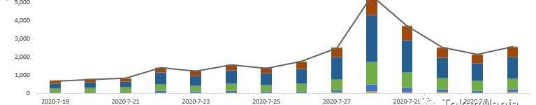 资料来源:CoinMarketCap,TokenMania2.交易所成交量:九大交易所日成交量均值大幅上涨162.51%本周九大交易所一周累计总成交量为20521.00亿元人民币,较上周上升12703.70亿元,增幅为162.51%,九大交易所本周单日成交量均值为2931.57亿元,较上周上升1814.81亿元,增幅为162.51%;从交易量结构来看,成交量占比前三名的交易所分别是Huobi(47.43%),Binance(23.44%),OKEX(20.13%),前三名交易所成交量占九大交易所总成交量的90.99%,前三名占比较上周增加0.63%;Huobi本周累计成交量较上周上升6326.27亿元,增幅为185.73%,Binance本周累计成交量较上周上升2705.65亿元,增幅为128.60%,OKEX本周累计成交量较上周上升2577.11亿元,增幅为165.85%。图3近两周九大交易所总成交量变化