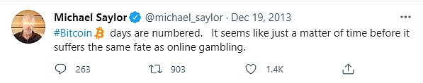 虽然加密市场中的大多数投资者对于MicroStrategy的了解不过一两年的时间,但是细数起来,MicroStrategy的发展历程却已经超过了30年。1989年11月,MicroStrategy成立于美国弗吉尼亚州泰森斯角,是一家提供商业智能、数据分析、移动软件开发和云端运算的企业,在它成立后30年的时间里,MicroStrategy一直坚持在其主营业务上,并没有传出它与加密资产有过什么交集,甚至该公司的CEO Michael Saylor(迈克尔·塞勒)在2013年时还曾于社交平台抨击过比特币,称比特币的日子屈指可数。