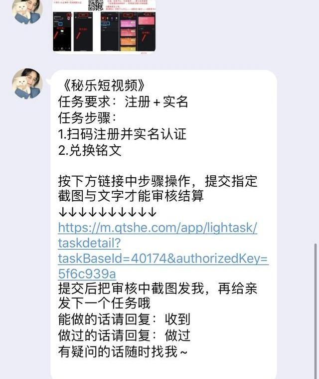 点击报名,系统给我推了对方的联系方式。加QQ之后,就收到一段自动回复的话术,告诉我工作内容是下载体验APP,简单轻松,1~5分钟做一单,价格每单1~10元,做满8单即可结算。回复“明白”开始做单。见我没反应,客服主动问:宝贝,可以开始了吗?服务态度是真滴好,我也表现得很乖巧:嗯呢,开始吧,小姐姐~好家伙!第一个任务就是秘乐,并附带详细的注册流程图。我只能假装已经注册过了。