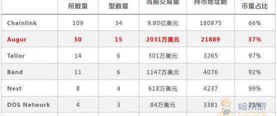 各预言机项目的交易所支持情况及日交易量增长情况有着较长的发展历史,Augur在市场认可度以及用户基础方面存在一定优势。其持币地址数、链上活跃度以及上线交易所数仅次于Chainlink且远高于BandProtocol、DOSNetwork等新兴预言机项目;同时Augur还是该领域内资产分布最为分散的项目。除了Augur之外,其余预言机网络有超五成的流通货币集中在持币量排名前十的地址身上。