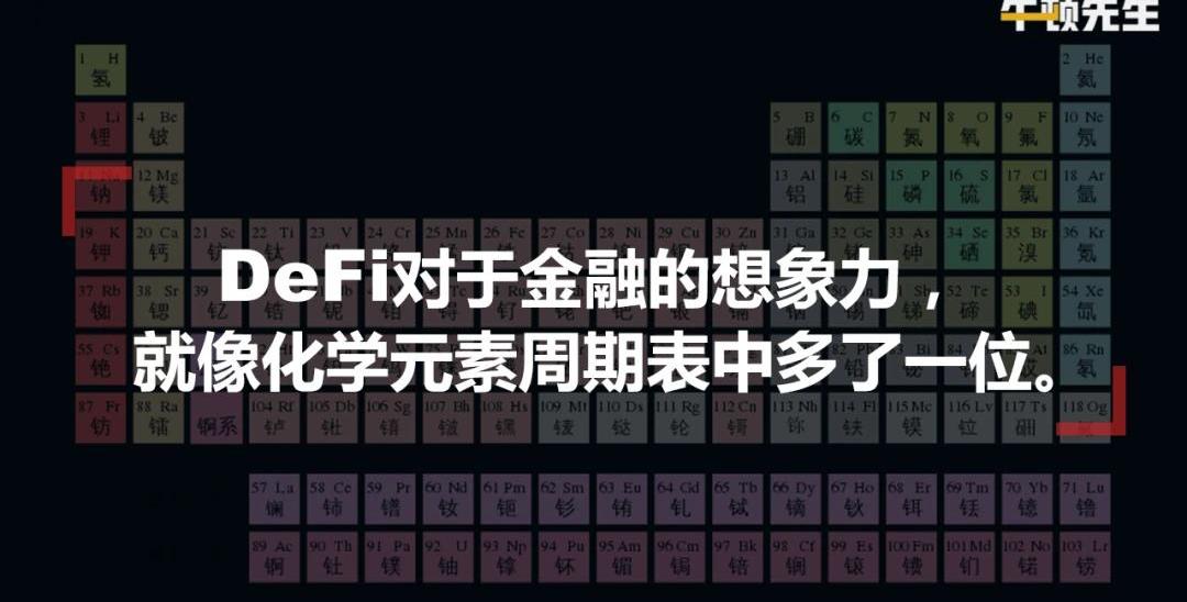 编者按:本文来自牛顿先生拆解区块链,作者:牛顿先生,Odaily星球日报经授权转载。对贺宝辉《中国创投集体踏空,DeFi开启区块链落地》一文的评价——朱嘉明DeFi和“涌现性”在科技与金融的结合或者融合中,存在金融科技化和科技金融化两个并行的路线。随着时间的推移,科技金融化显现了更大的潜力和发展空间。因为科技金融化可以通过科技成果直接创造新的金融形态。DeFi正在成为最值得关注的一种金融形态。DeFi并非是全新的概念,也不是以全新技术为基础,但是,DeFi开始证明它具有复杂科学关注的“涌现性”特征,即基于“整体大于部分之和”的自组织特征。传统金融体系的根本困境的根本原因在其制度架构和技术基础的滞后,无法适应货币金融生态的变异和自组织的内在需求。请大家再温习人们关于复杂性和涌现性的事例:单只蚂蚁几乎没有智商,不会形成任何影响。但是,由上百万只蚂蚁构成的群体,构造出“超生物”的复杂结构,并产生“集体智能”。宝辉的这篇文章对DeFi的性质,潜质和张力,以及趋势做了初步探讨,字里行间透出对DeFi历史意义的期许。无论如何,如果深入思考区块链与金融的结合,全面而不是片面的分布式金融或非中心化金融的发展,都需要关注DeFi。朱嘉明2020.7.8.公元2009年,化学家发明了一种新元素,那一刻元素周期表中突然多了一位。这种改变不是家里多了把椅子,世间多了粒尘埃。而是这个新元素将和前118种元素一起组合,创造无法穷尽的新物种。整个世界换了幅模样。我们将金融元素周期表多了一位后的世界,称之为DeFi。