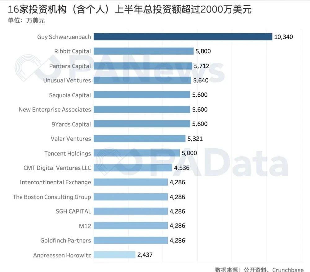 PAData根据披露的融资总额和投资方,在不考虑领投与跟投等投资行为差异的情况下,以融资总额/投资方数量估算每个投资方单项平均投资额,以此预估上半年每个投资方的投资金额。但这只是一个估计值,由于忽略了差异,这一估计值可能较实际金额偏高,因此只能为了解投资方的投资行为提供一定程度的参考。根据统计,16家投资投资机构上半年对区块链领域的投资总额超过了2000万美元,其中,GuySchwarzenbach和RibbitCapital的投资金额最高,分别达到了1.03亿美元和0.58亿美元,前者投资了瑞士加密银行SEBA,后者投资了交易平台Robinhood和LightningLabs。