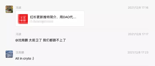 而后,红杉资本全球执行合伙人沈南鹏与 Dragonfly Capital 创始人合伙人冯波的聊天记录中,沈南鹏也表示正「All in cryto」。或许是有点激动,沈南鹏还将「Crypto」拼错了。