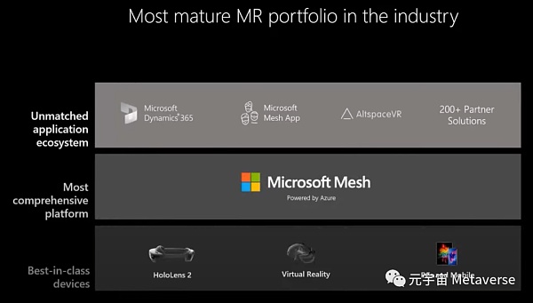 说到微软混合现实,我们首先想到的可能就是MR头显(HoloLens,?混合现实头戴式显示器)。实际上微软混合现实是由应用系统、平台、设备组合而成(如下图)。